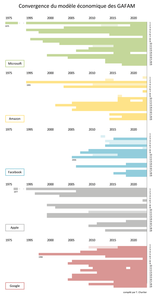Je parlerai surtout des GAFAM, les plus avancés et les plus présents, et je traiterai à part les BHATX. Le cas d’Elon Musk est particulier car son empire repose encore sur l’économie matérielle (voitures électriques, navettes spatiales, tunnels), mais je tends à l’inclure dans le même sac puisqu’il s’est enrichi en fondant PayPal et continue de s’appuyer sur l’économie immatérielle et l’IA (Twitter, début d’OpenAI, X.AI …).